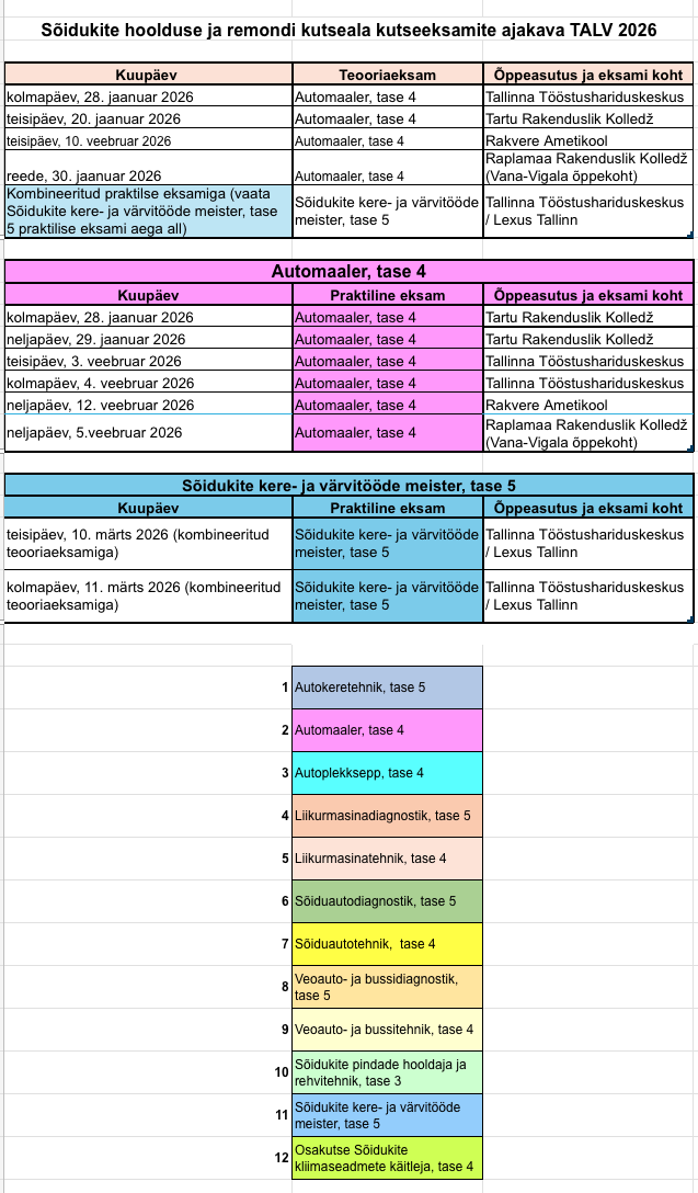 Alltoodud tabelist ja kalendrist leiad hetkel kinnitatud Autokutseõppe Liidu poolt korraldatavad kutseeksamid.